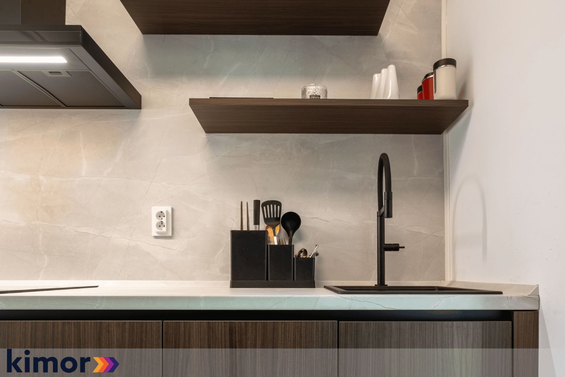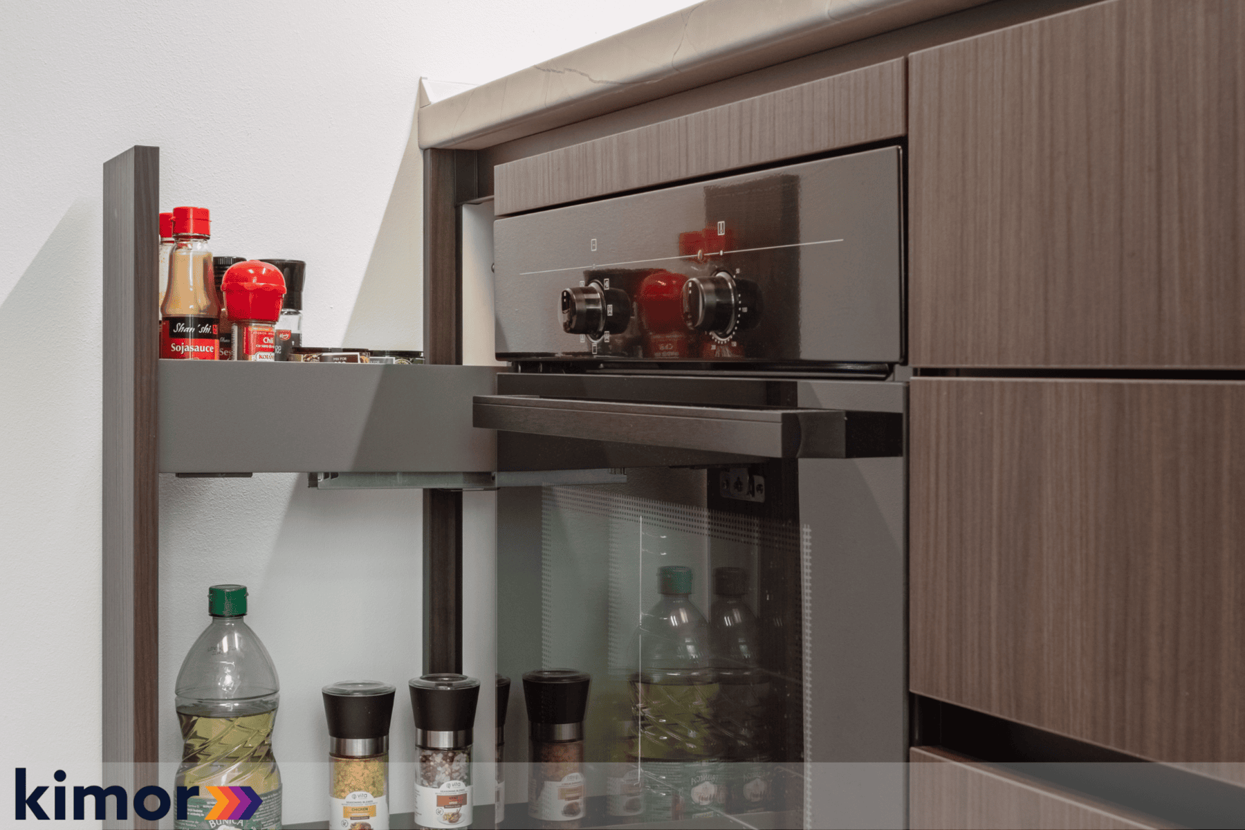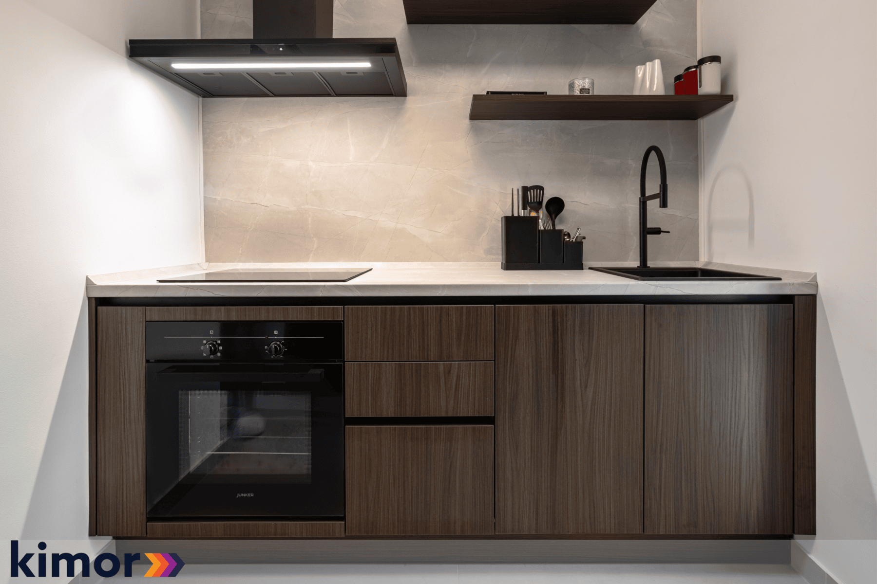 Când spațiul pare o provocare, noi vedem o oportunitate. Această bucătărie Kimor din București valorifică perfect doi pereți față în față, creând un design practic, echilibrat și plin de stil, cu fronturi calde de nuc Milano, blat cu aspect de marmură gri Caspian și mânere negre elegante.