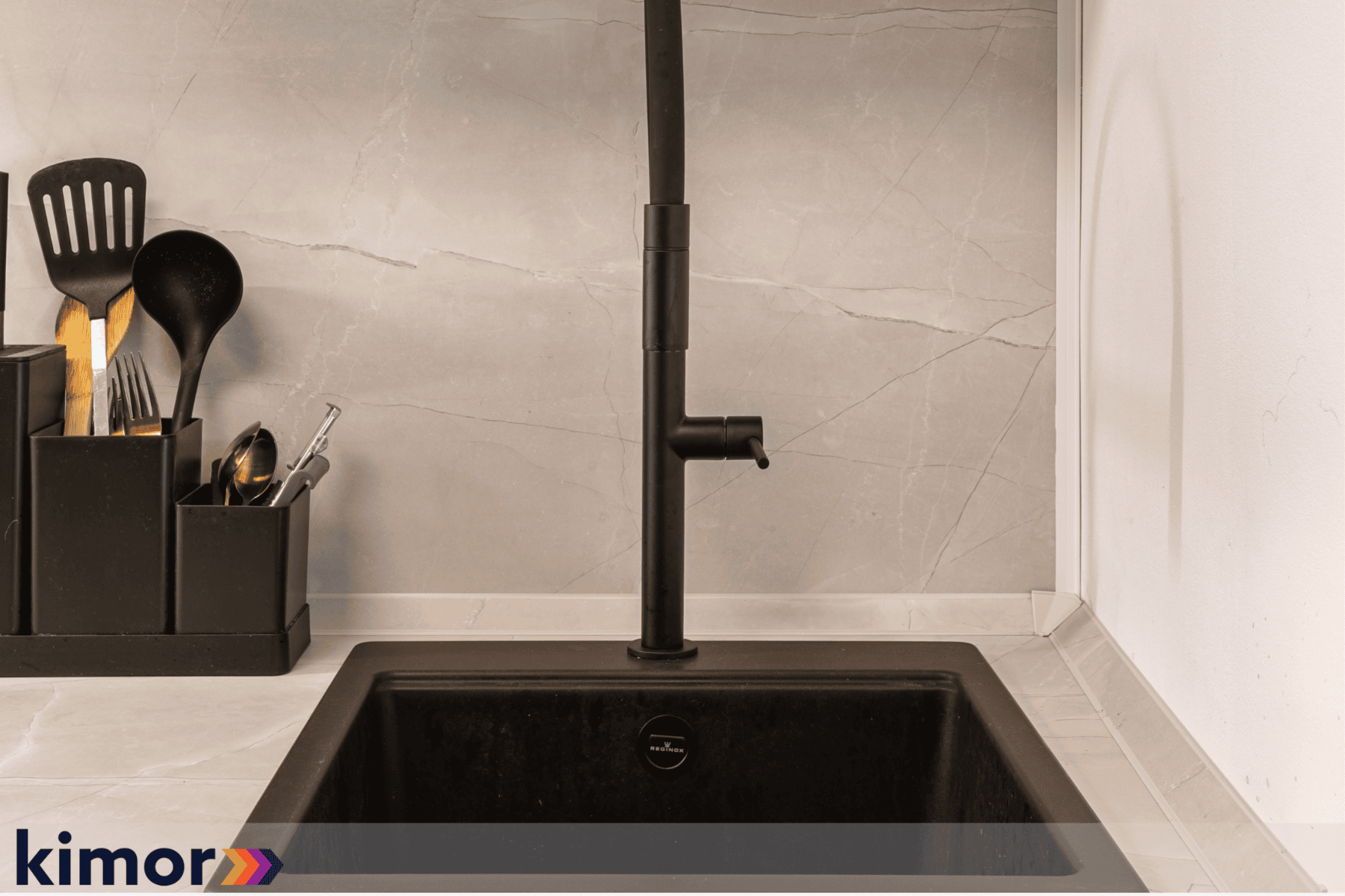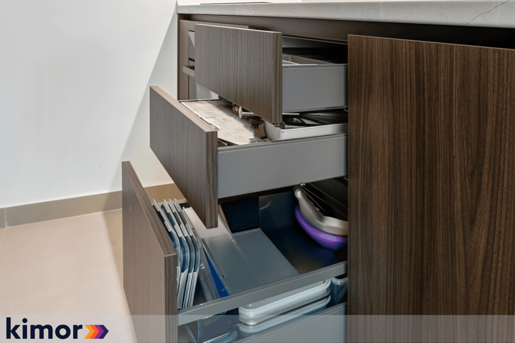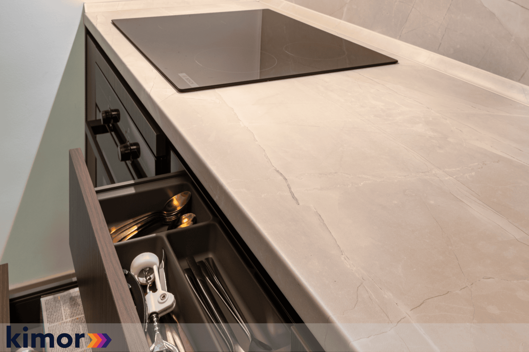 Când spațiul pare o provocare, noi vedem o oportunitate. Această bucătărie Kimor din București valorifică perfect doi pereți față în față, creând un design practic, echilibrat și plin de stil, cu fronturi calde de nuc Milano, blat cu aspect de marmură gri Caspian și mânere negre elegante.