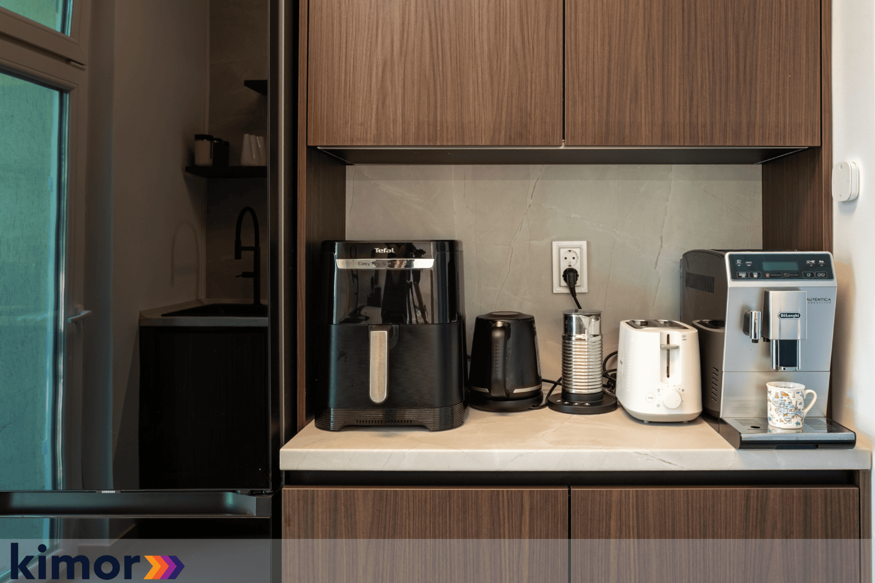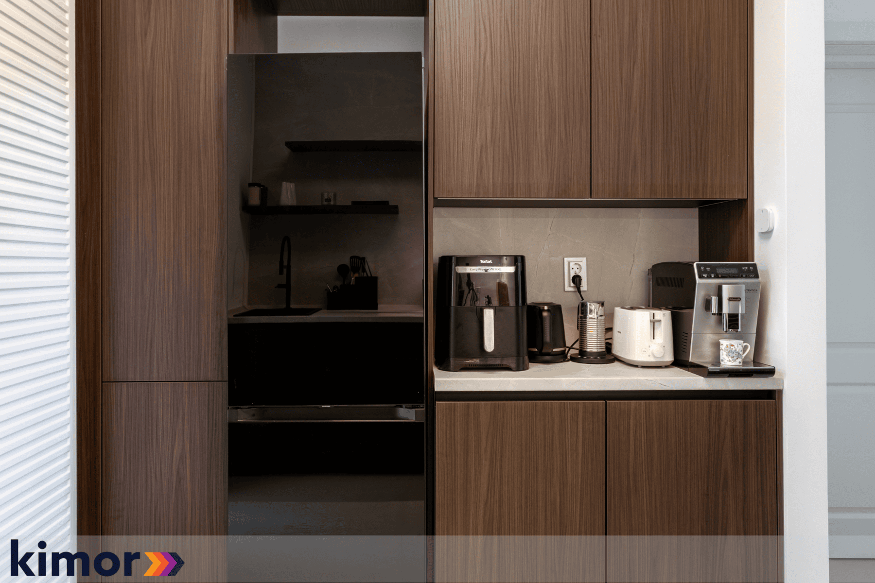 Zona de gătit include o plită neagră cu inducție și hotă cu bandă LED discretă, iar pe peretele opus, frigiderul și coffee cornerul cochet oferă spații de depozitare bine integrate. Două laturi care se privesc fără să se încurce, pentru o bucătărie funcțională și cu personalitate, chiar și într-un spațiu atipic.