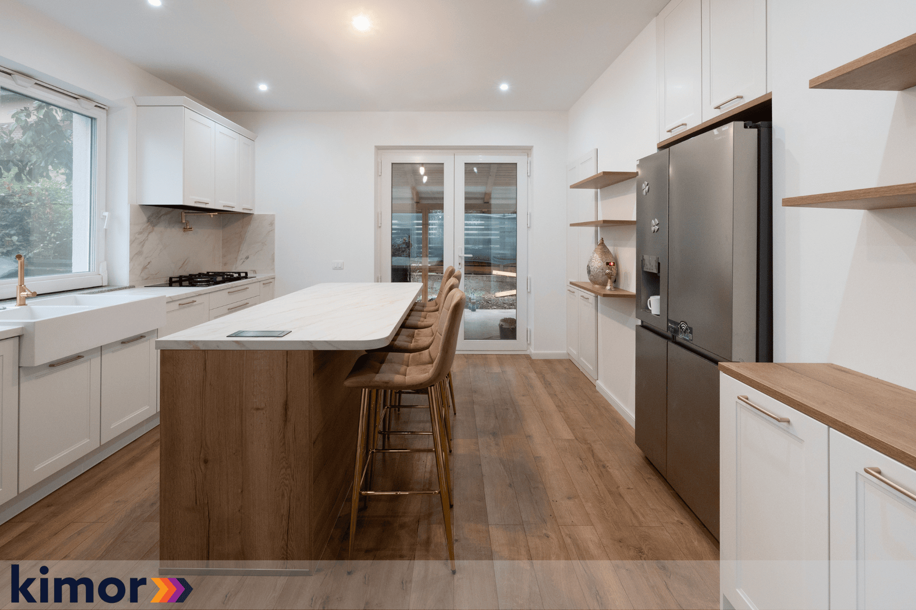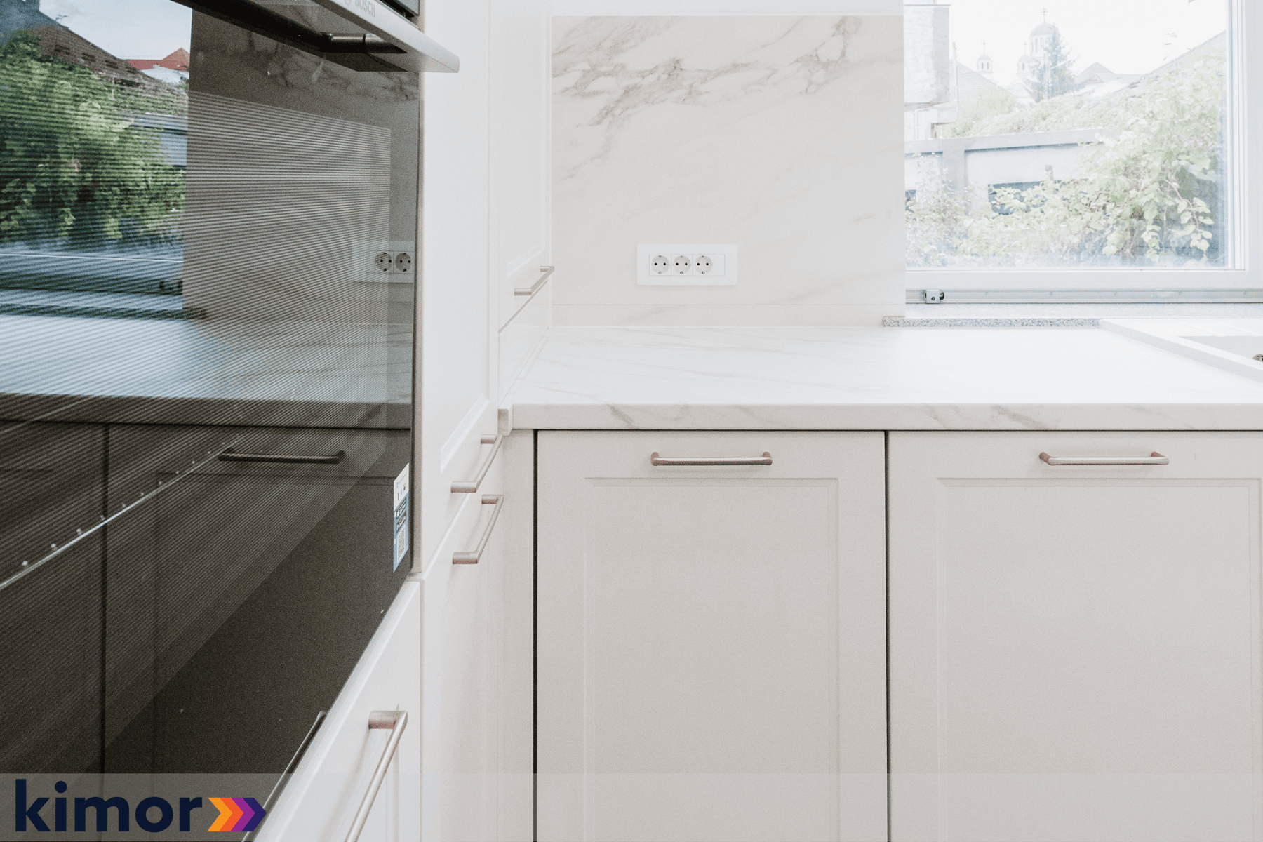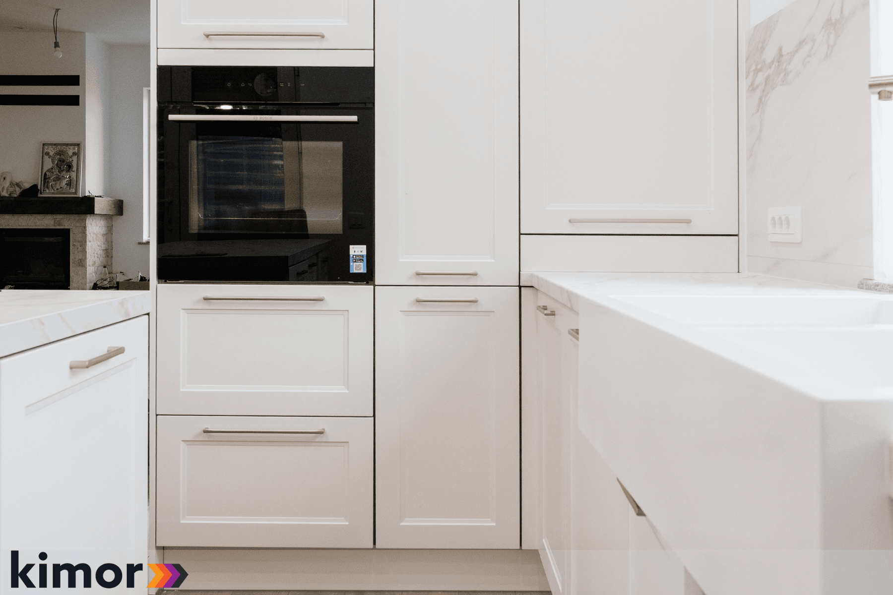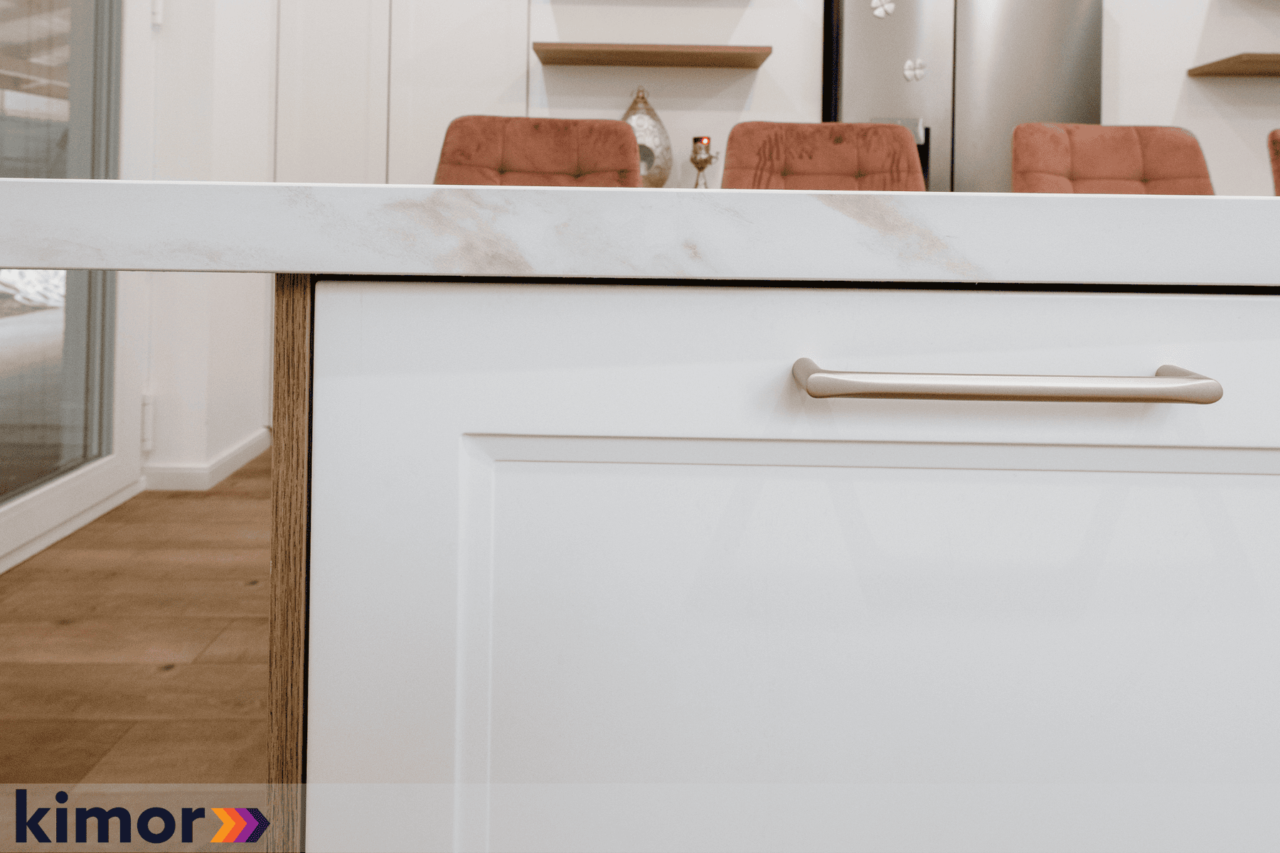 Insula, cu loc de luat masa integrat și blat cu colțuri rotunjite, devine punctul de întâlnire al întregului spațiu. Electrocasnicele complet încorporate și albul cald al mobilierului întregesc atmosfera bucătăriei și inspiră eleganță și rafinament.