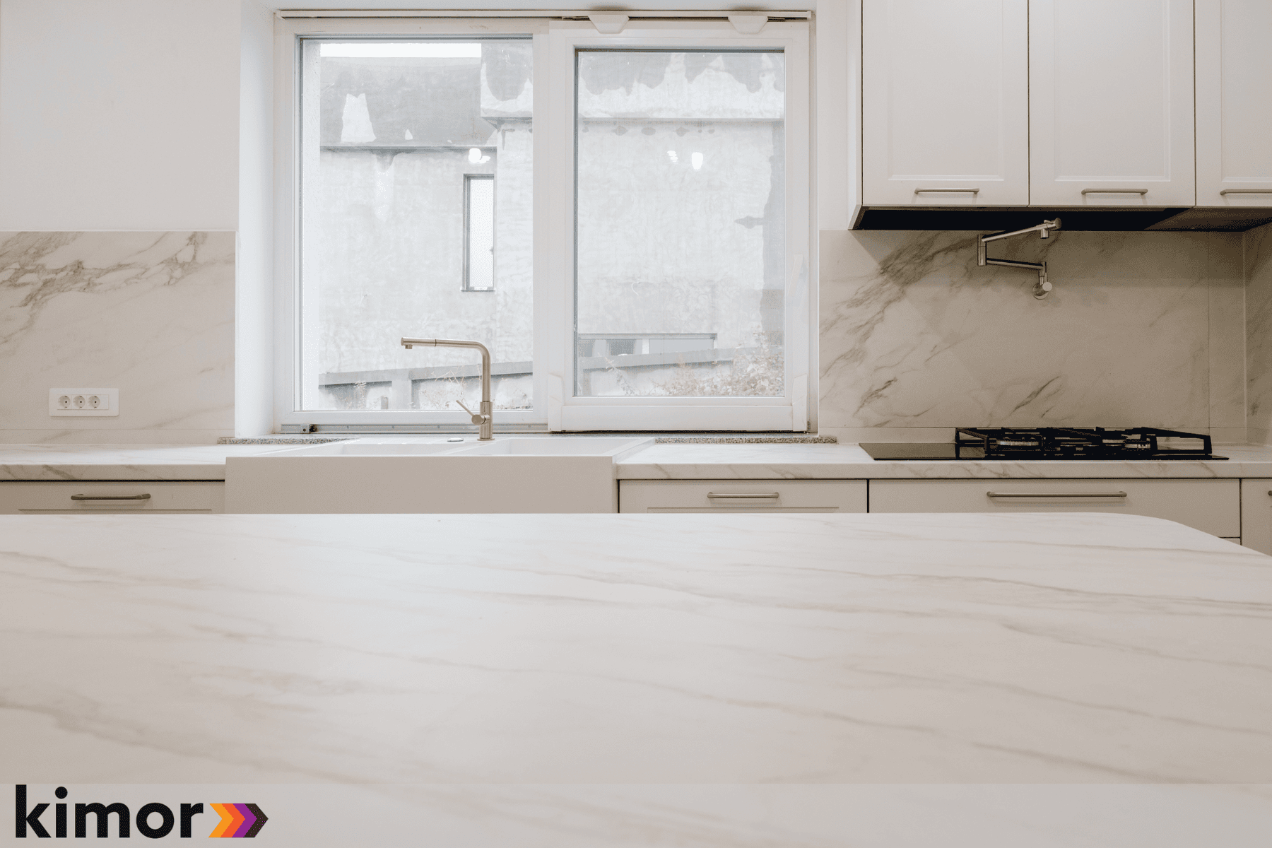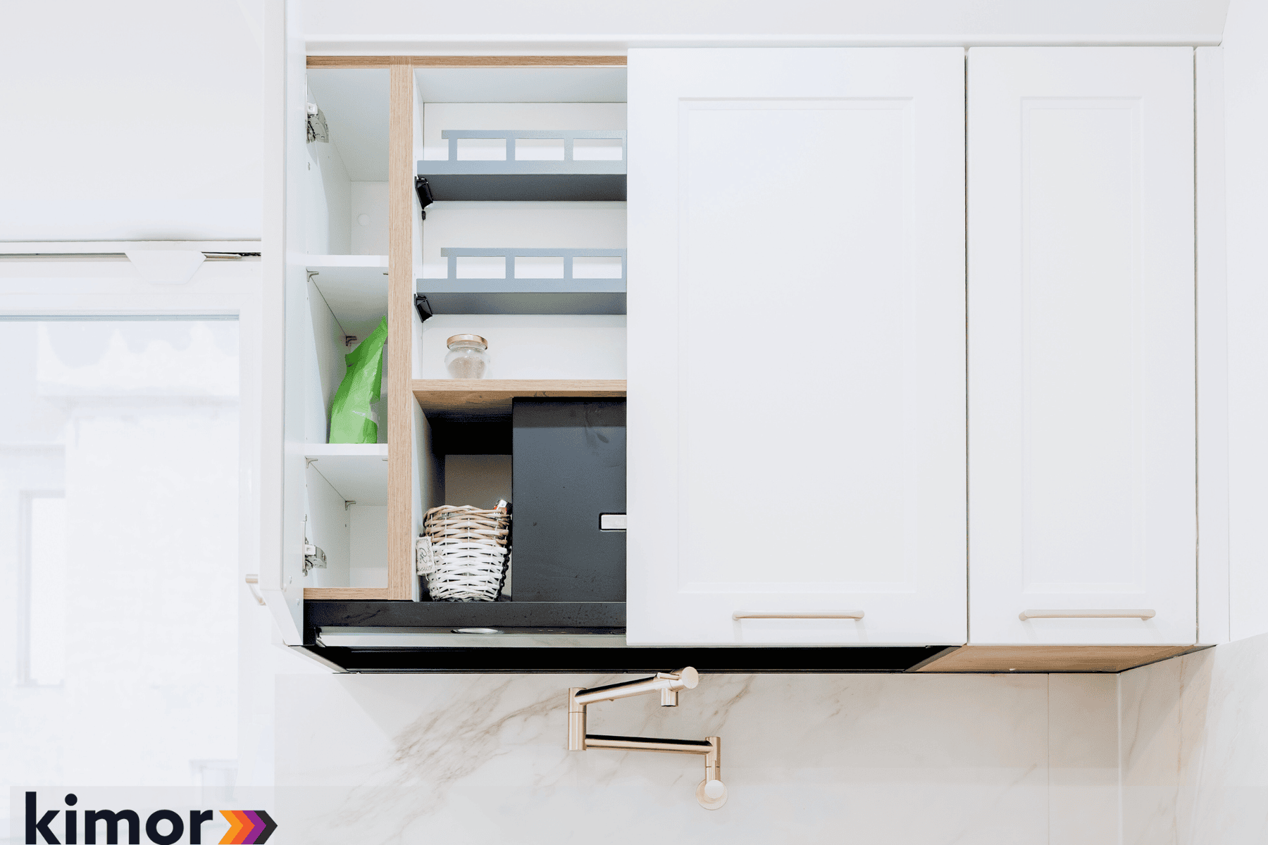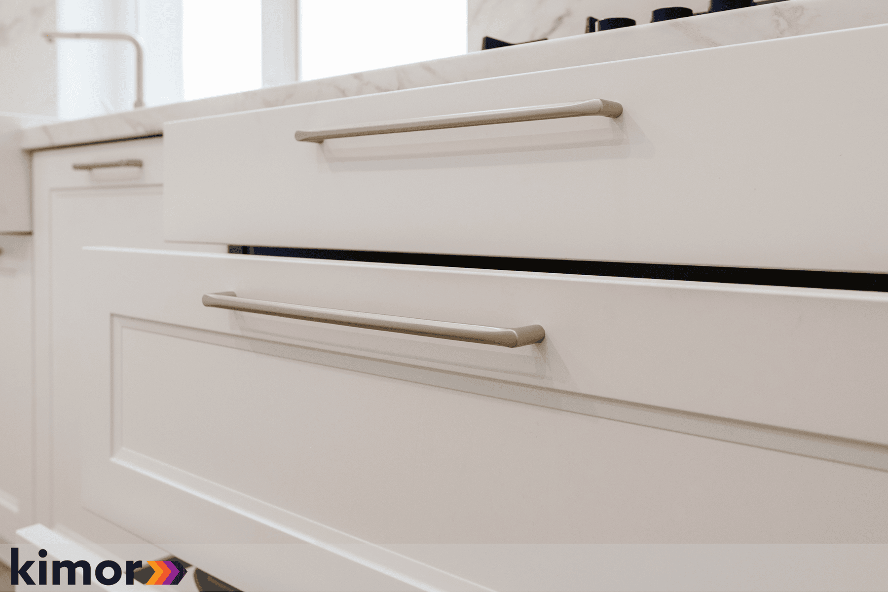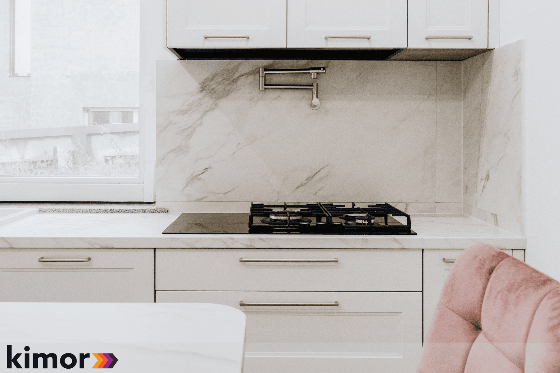 Insula, cu loc de luat masa integrat și blat cu colțuri rotunjite, devine punctul de întâlnire al întregului spațiu. Electrocasnicele complet încorporate și albul cald al mobilierului întregesc atmosfera bucătăriei și inspiră eleganță și rafinament.