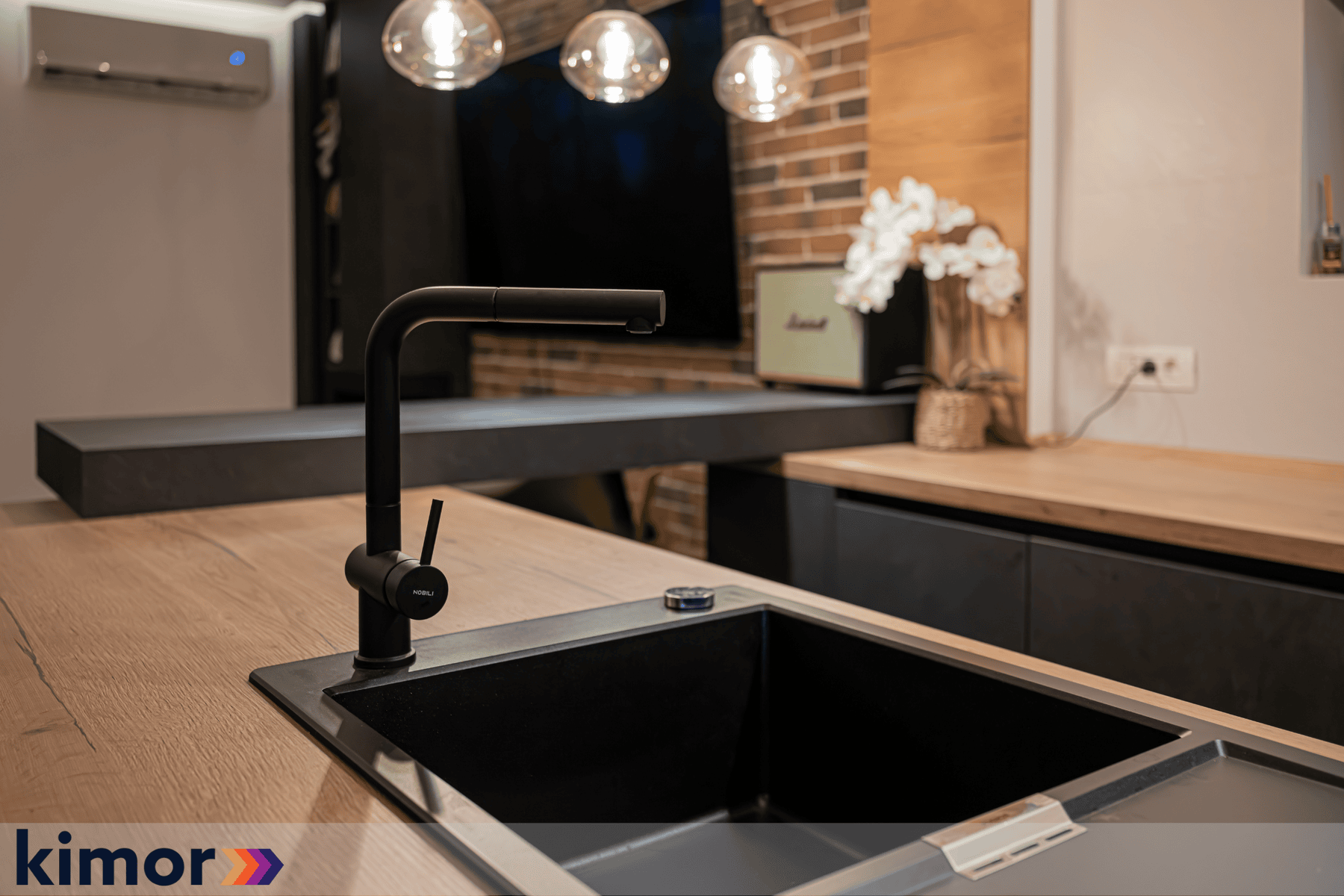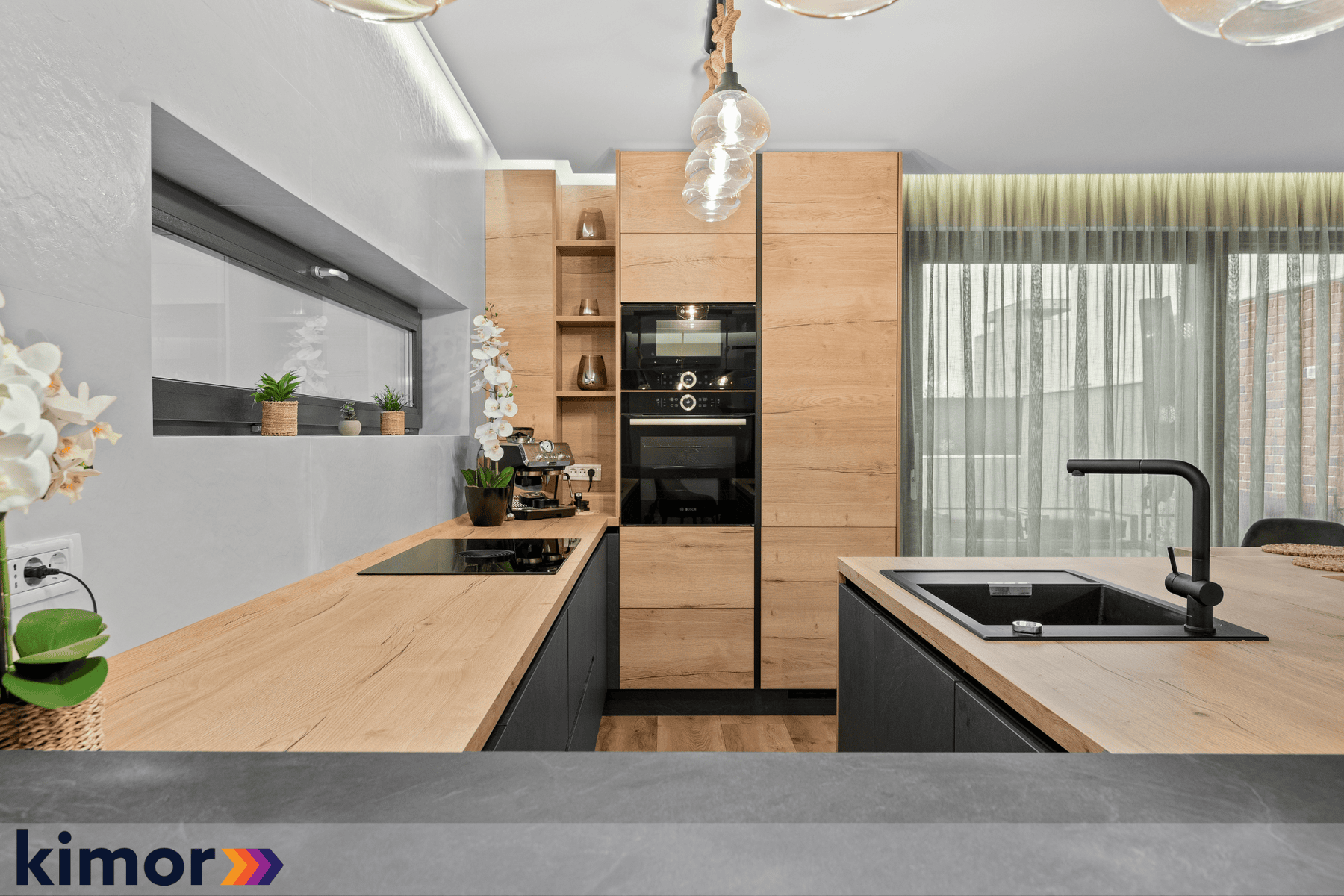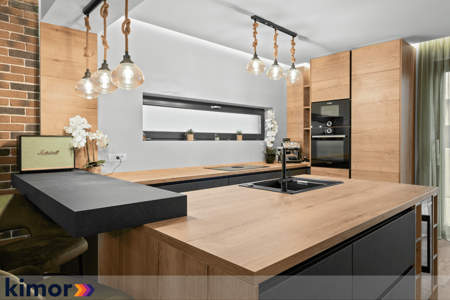 Într-un open-space bine organizat, această bucătărie gri închis, completată de texturi din lemn, aduce structură și echilibru vizual.