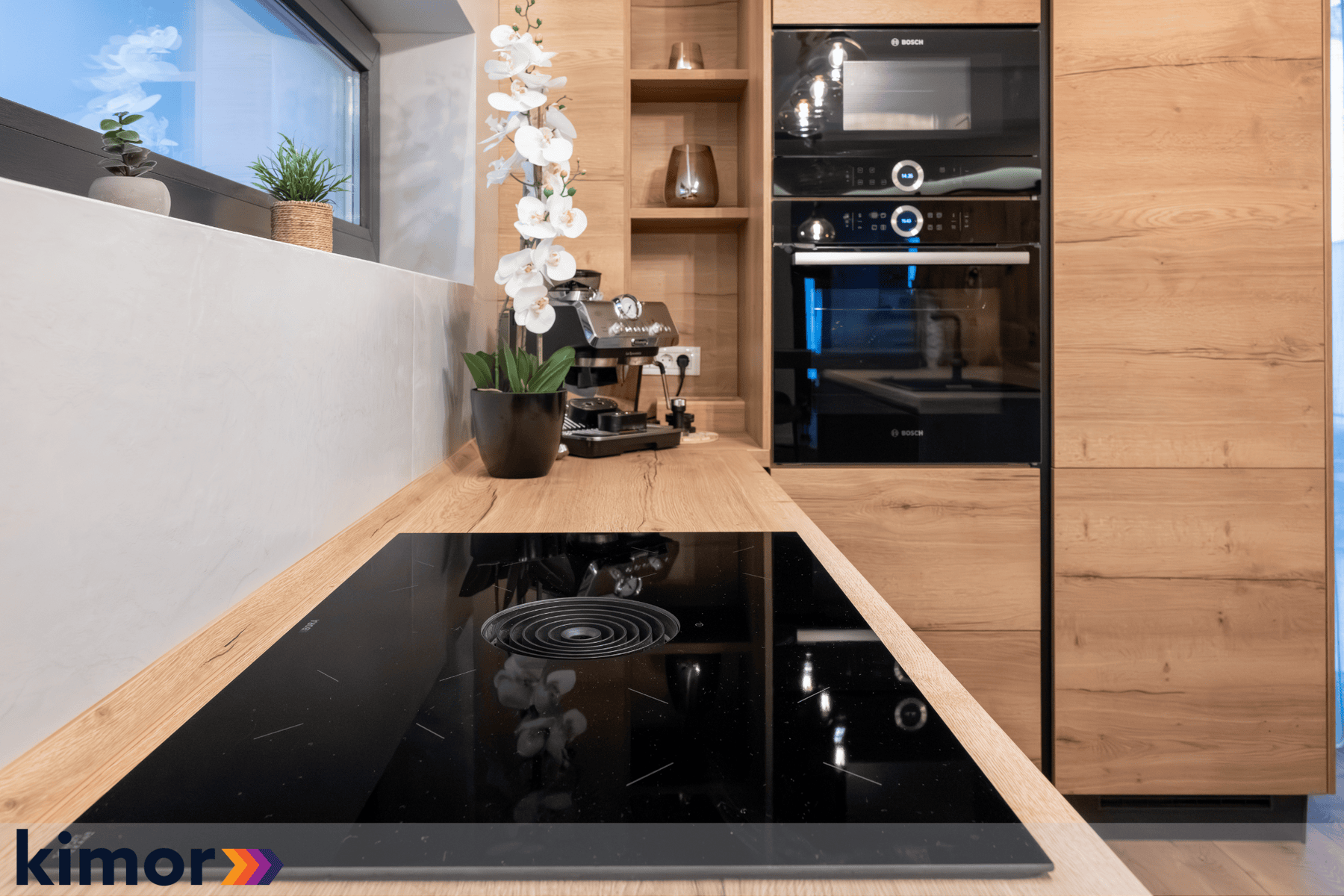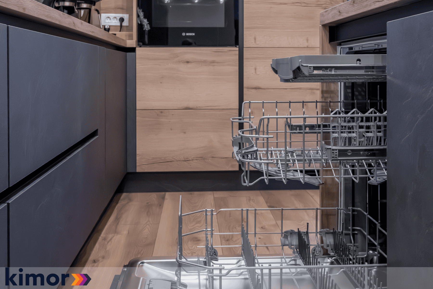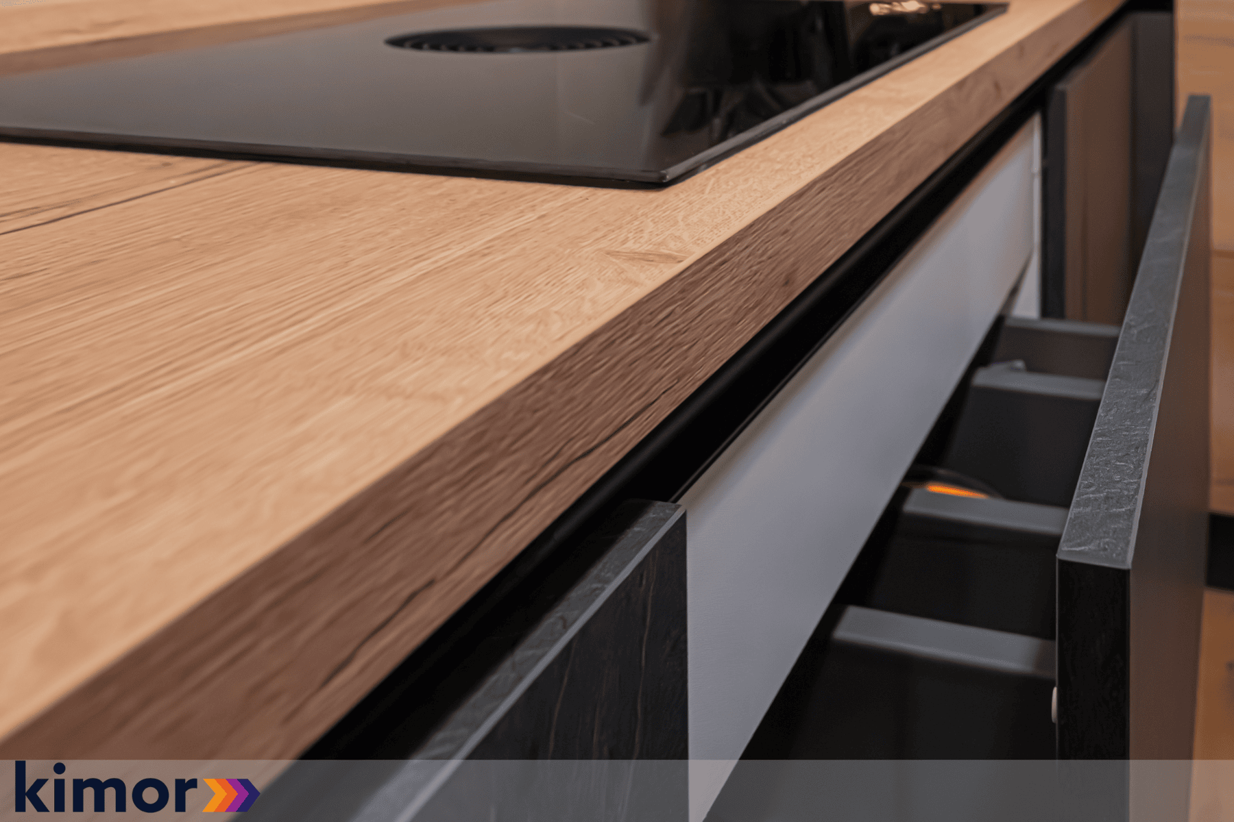 Într-un open-space bine organizat, această bucătărie gri închis, completată de texturi din lemn, aduce structură și echilibru vizual.