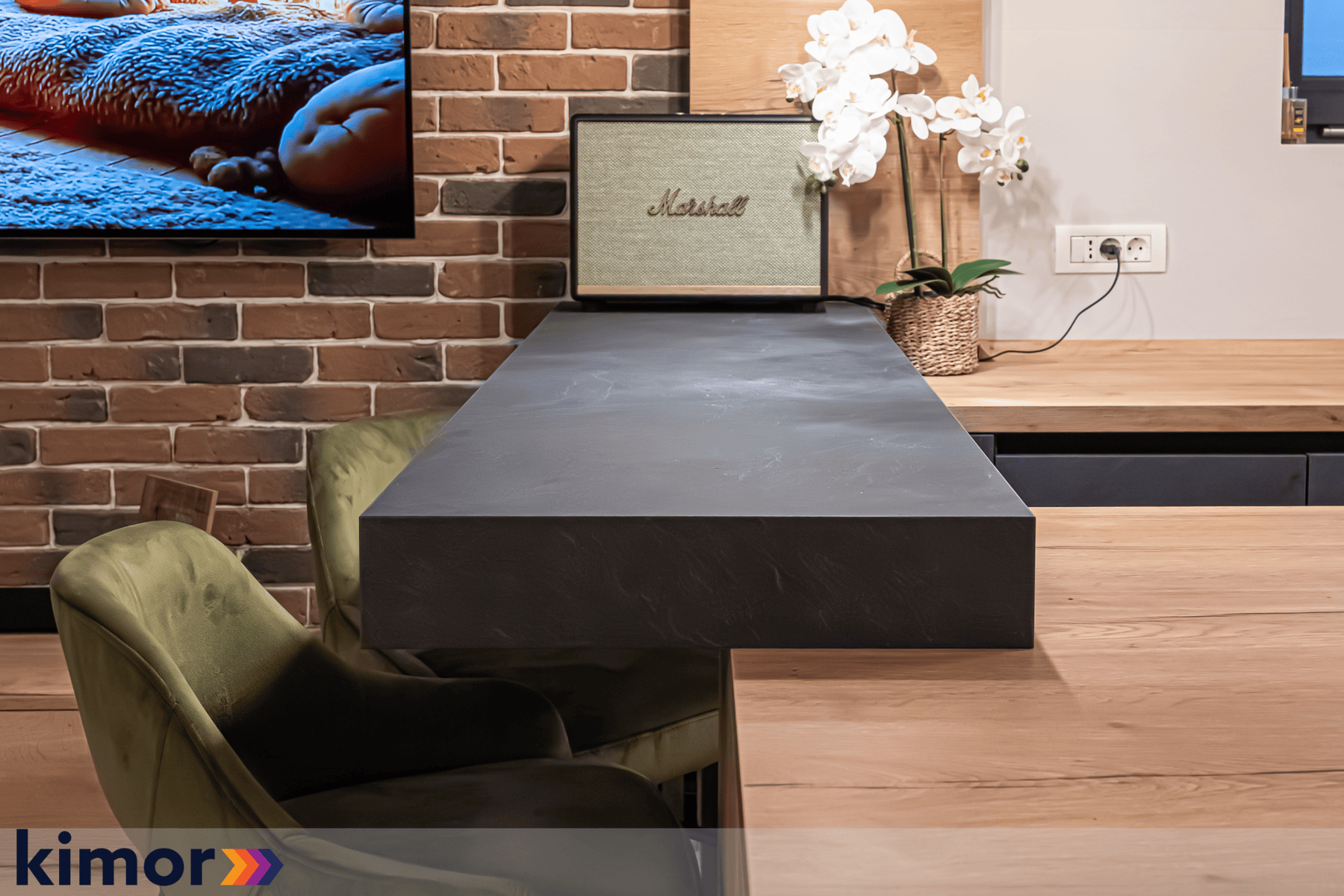 Blatul în consolă delimitează discret bucătăria de living și creează un loc de bar integrat natural între cele două zone. Rezultatul este un spațiu contemporan, autentic, cu aer urban și fără elemente în exces.