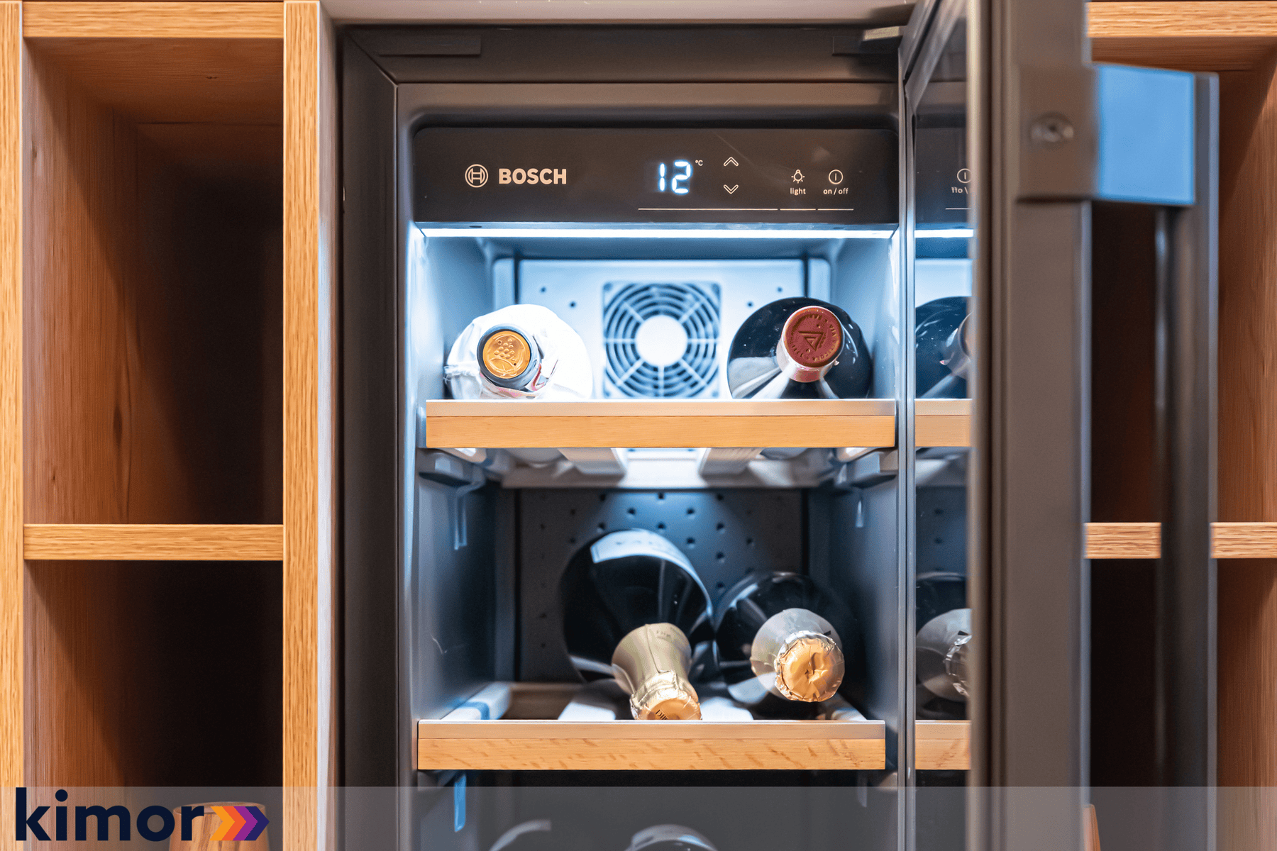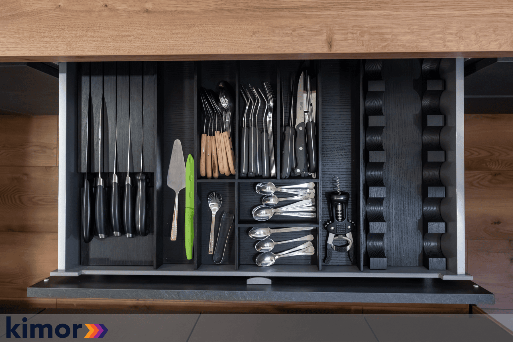 Depozitarea este inteligent gândită chiar și fără corpuri suspendate: coloanele încorporează cuptoarele și frigiderul, zona de perete este dedicată plitei iar insula suplimentează spațiul necesar prin depozitarea pe cele două laturi.