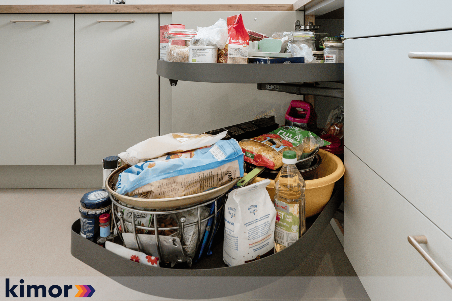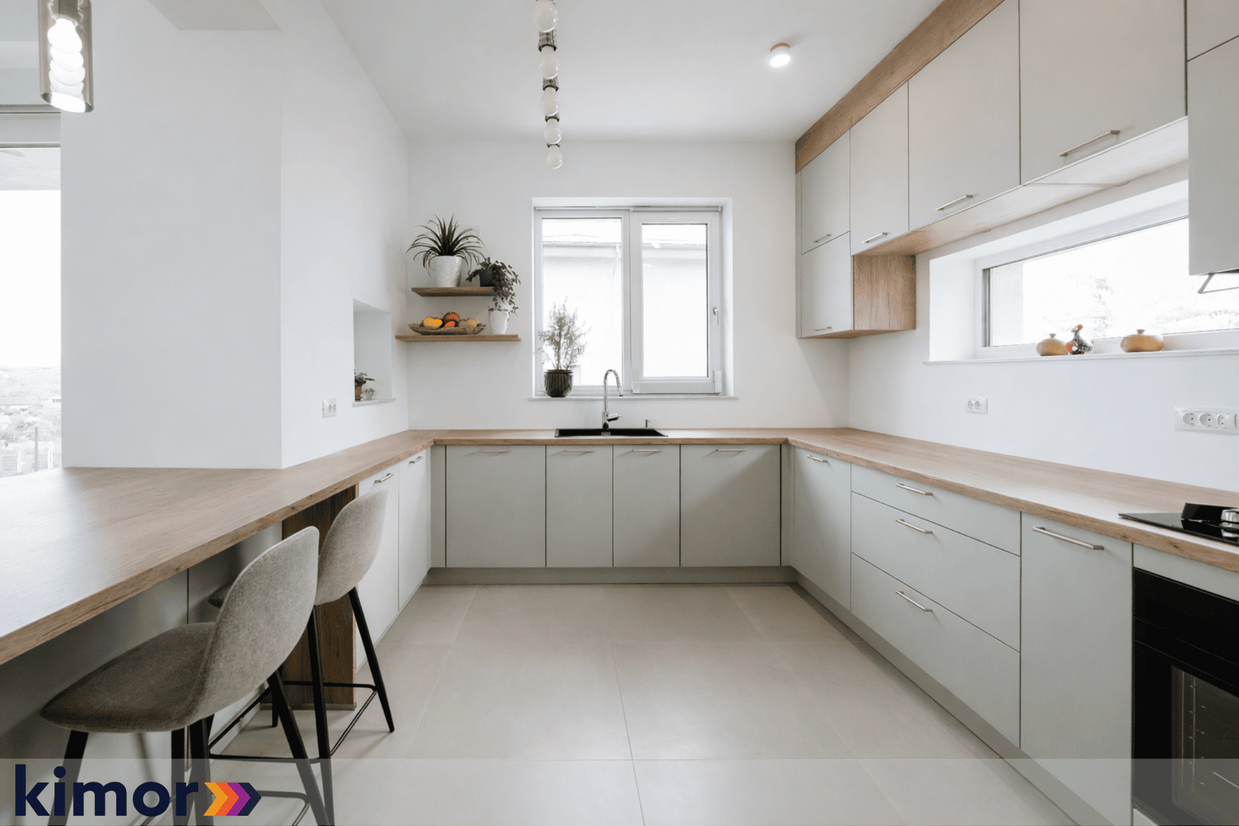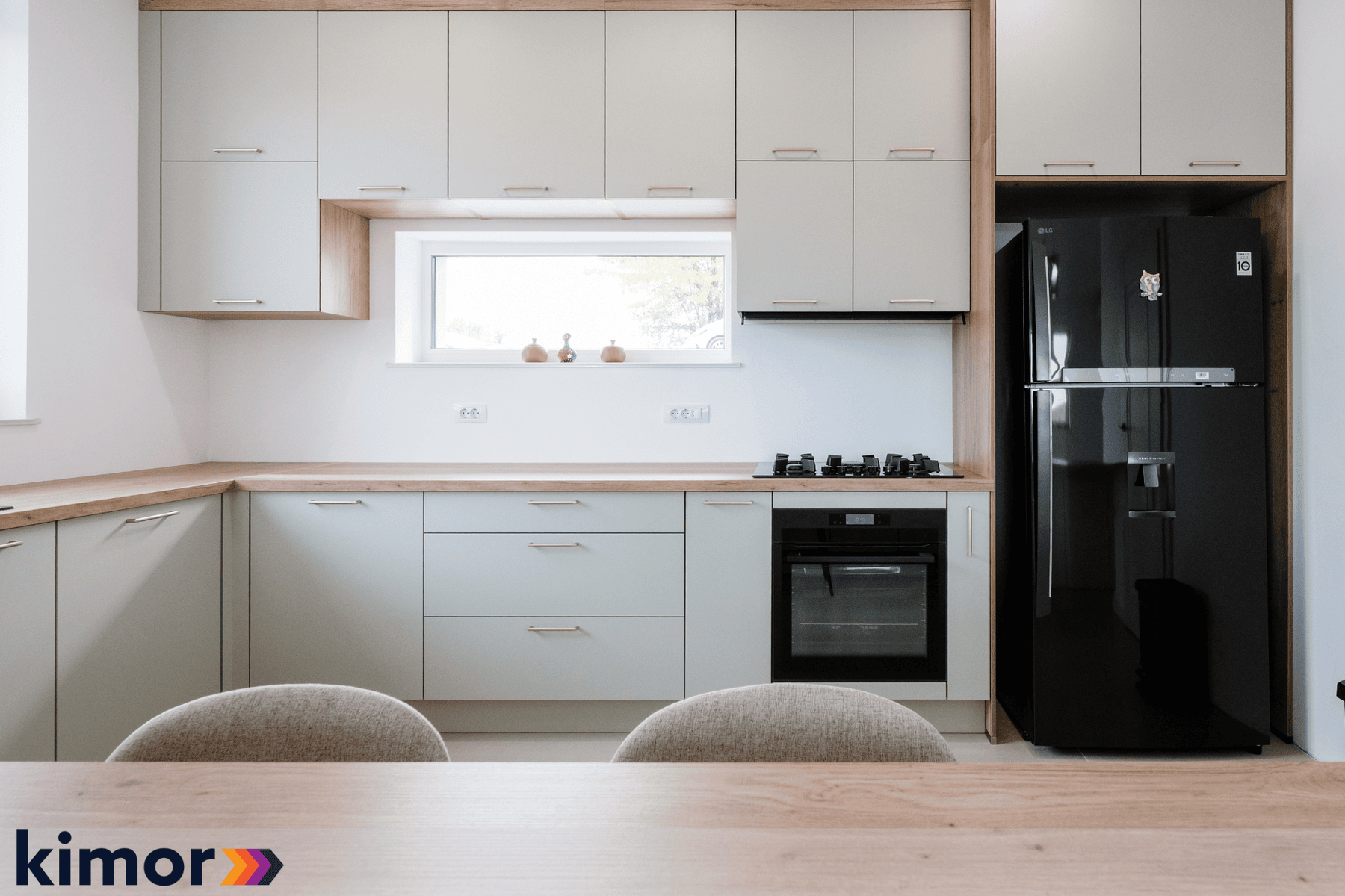 Peninsula devine piesa centrală a spațiului: are locuri de luat masa și zone pentru depozitare sub blat, ușor de accesat prin deschidere push-to-open. Mânerele aurii subliniază tonurile verzi și adaugă o notă subtilă de eleganță. Atmosfera e aerisită, caldă și primitoare, exact cum trebuie să fie o bucătărie în care te simți bine primit!