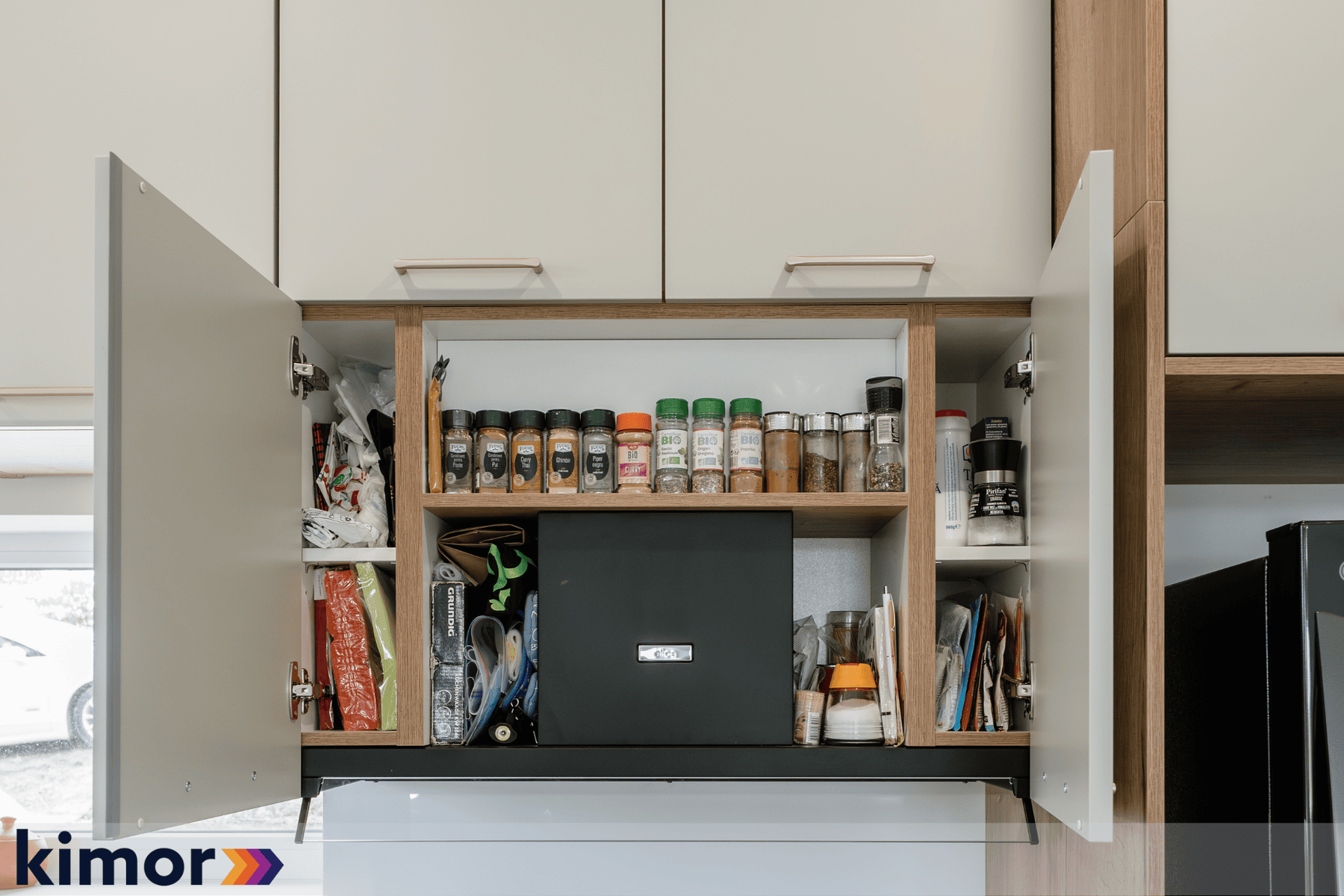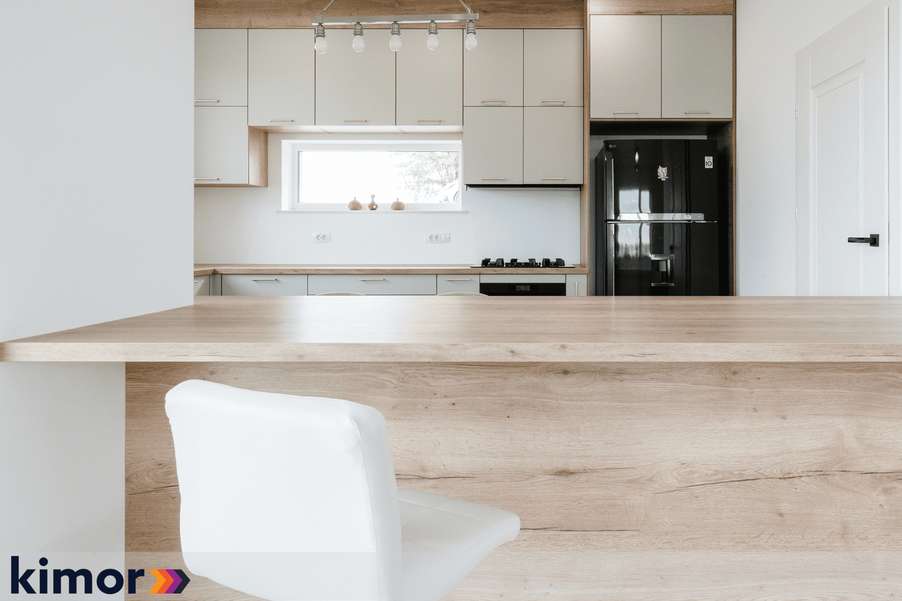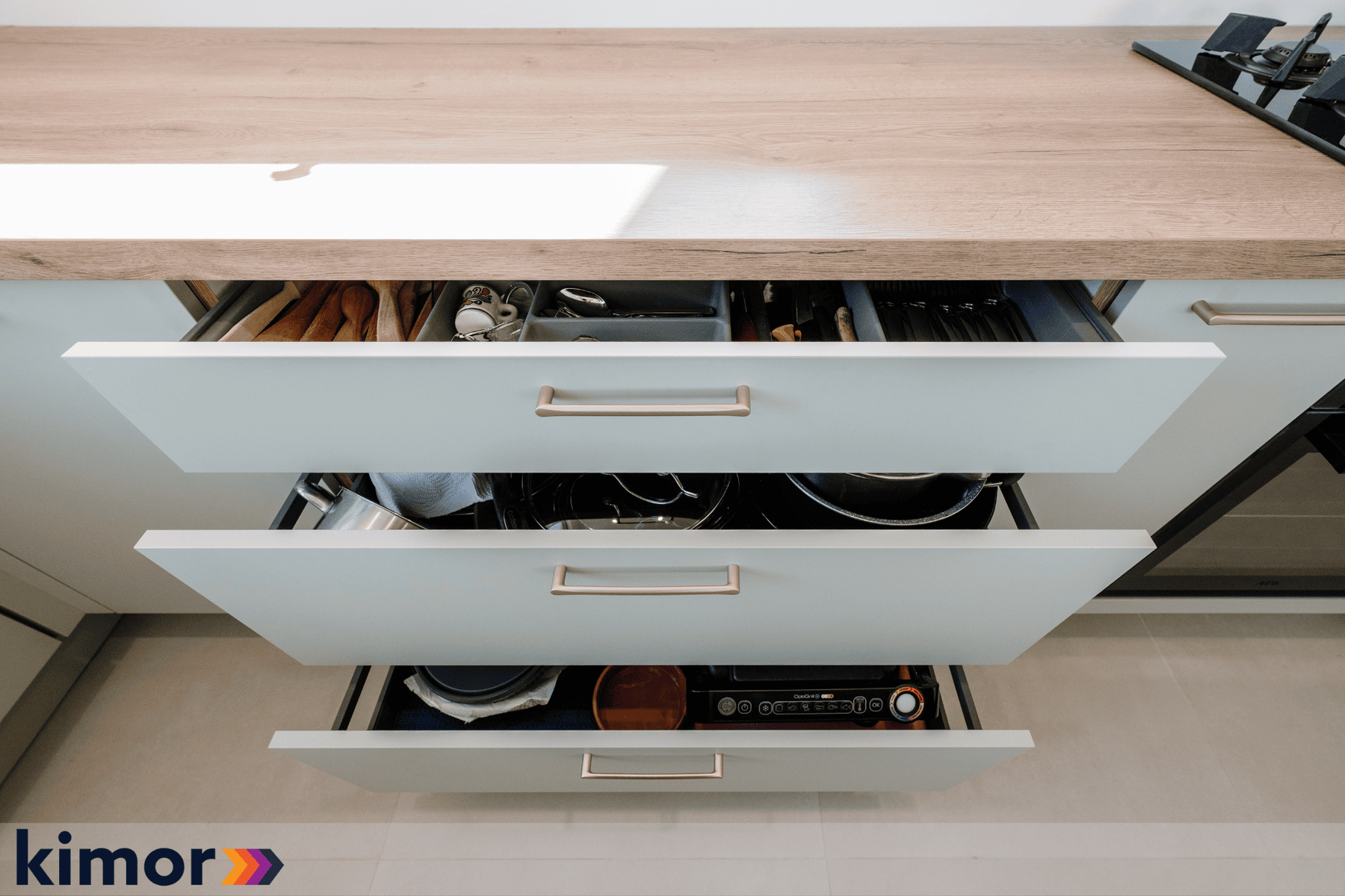 Peninsula devine piesa centrală a spațiului: are locuri de luat masa și zone pentru depozitare sub blat, ușor de accesat prin deschidere push-to-open. Mânerele aurii subliniază tonurile verzi și adaugă o notă subtilă de eleganță. Atmosfera e aerisită, caldă și primitoare, exact cum trebuie să fie o bucătărie în care te simți bine primit!