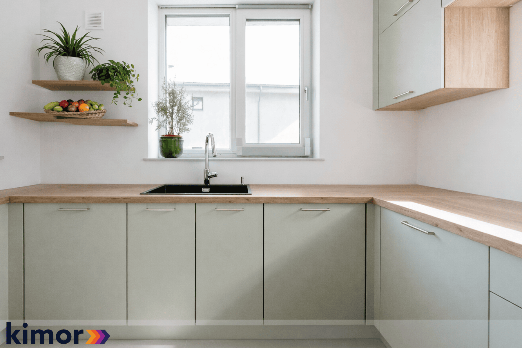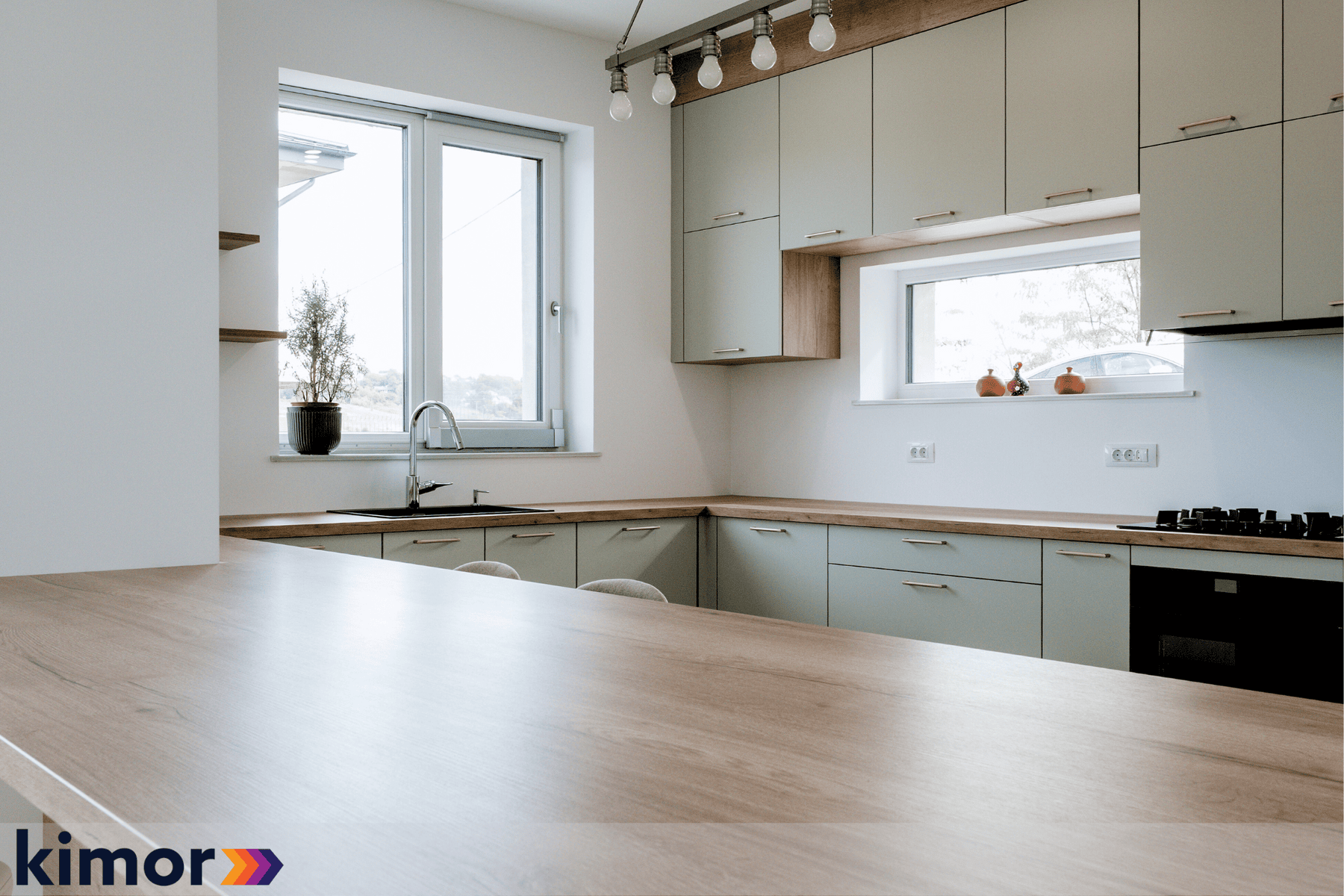 Această  mobilă de bucătărie verde în formă de U, combină fronturile Verde Jad din colecția Plush cu blatul în nuanța Stejar Sierra – o întâlnire între naturalețe și energie calmă, pusă în valoare de detalii aurii și linii ordonate, frumos proporționate.